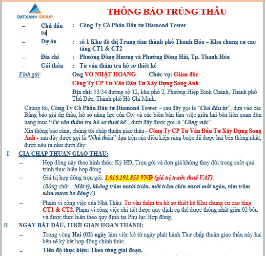 Xin thông báo rằng, chúng tôi chấp thuận giao thầu - Công Ty CP Tư Vấn Đầu Tư Xây Dựng Song Anh - sau đây được gọi là “Nhà thầu” dựa trên các điều kiện ràng buộc đã được hai bên thống nhất, được nêu ra như dưới đây: