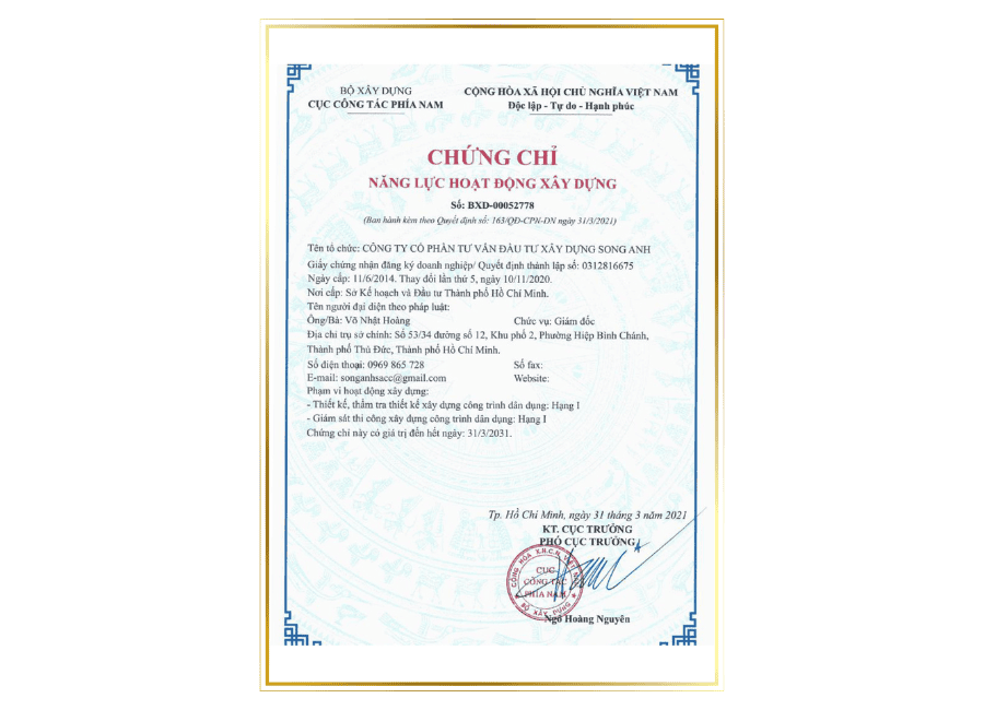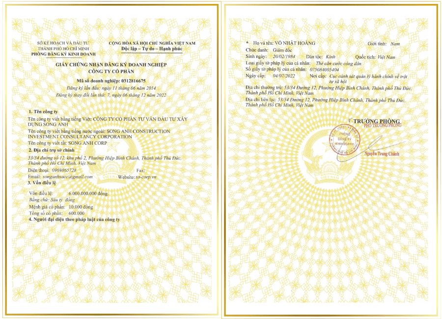 Giấy phép kinh doanh Công ty Cổ phần Tư Vấn Đầu Tư Xây Dựng Song Anh