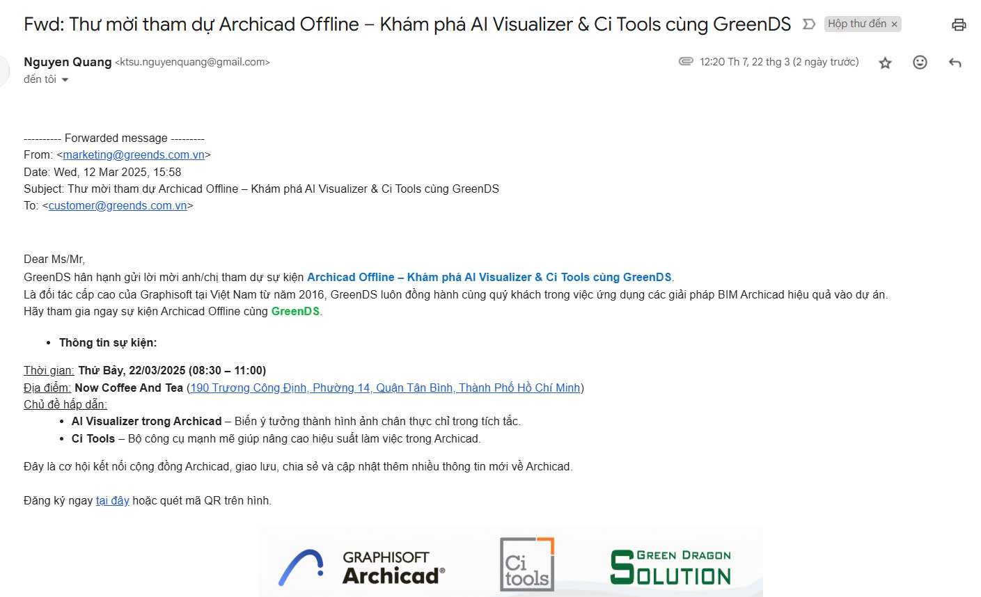 Song Anh vinh dự khi nhận được lời mời tham dự sự kiện đặc biệt "Archicad Offline - Khám phá AI Visualizer & Ci Tools" do GreenDS tổ chức. Đây là cơ hội tuyệt vời để Song Anh tiếp cận và trải nghiệm những công nghệ tiên tiến nhất trong lĩnh vực thiết kế kiến trúc. Sự kiện hứa hẹn sẽ mang đến những kiến thức chuyên sâu về AI Visualizer, công cụ giúp biến ý tưởng thiết kế thành hình ảnh 3D chân thực một cách nhanh chóng, cũng như Ci Tools, bộ công cụ hỗ trợ nâng cao hiệu suất làm việc trong Archicad. Với sự tham gia của các chuyên gia hàng đầu từ GreenDS, Song Anh sẽ có cơ hội được tìm hiểu, trao đổi và cập nhật những xu hướng mới nhất trong ngành.